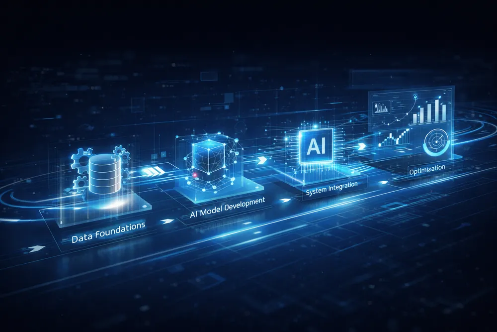 - An AI implementation roadmap guides organizations through discovery, pilot, scaling, and optimization phases, with each stage building capabilities supporting subsequent phases while delivering measurable business value justifying continued investment