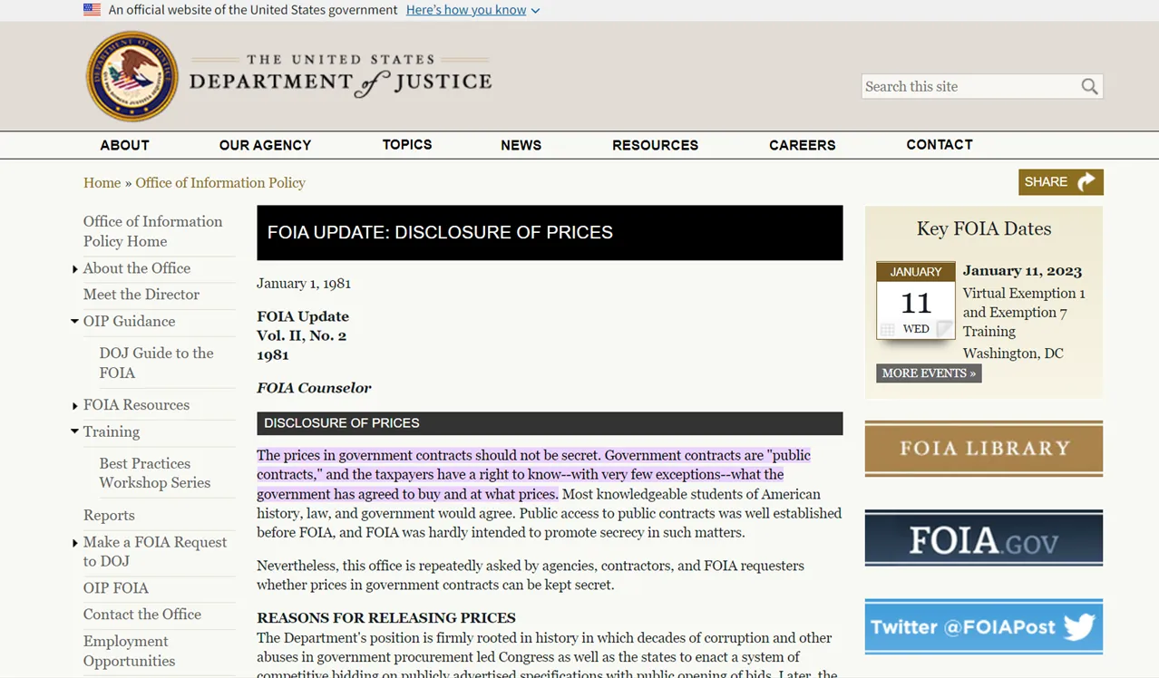 (1981). Disclosure of Prices. United States Department of Justice. Retrieved December 14, 2022, from https://www.justice.gov/oip/blog/foia-update-disclosure-prices#:~:text=The%20prices%20in%20government%20contracts,buy%20and%20at%20what%20prices.